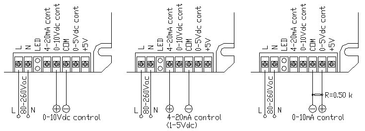 ④、4-20mA控制方式:按圖示,可接受溫控表等的4-20mA模擬信號,模塊內(nèi)部4-20mA端相對com端的輸入阻抗為250Ω。采用此方式時‘0-10Vdc’端與+5V端和cont端懸空。