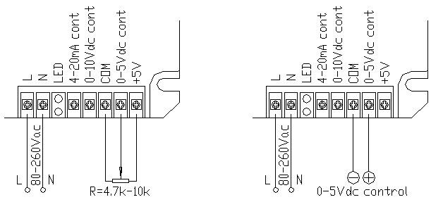 ②、0-5Vdc控制方式:按圖示,可接受單片機(jī)等的0-5Vdc模擬信號,輸入控制正極接cont端、負(fù)極接com端,模塊內(nèi)部cont端相對com端的輸入阻抗大于30KΩ。采用此方式時‘4-20mA’端和‘0-10Vdc’端及+5V端懸空。