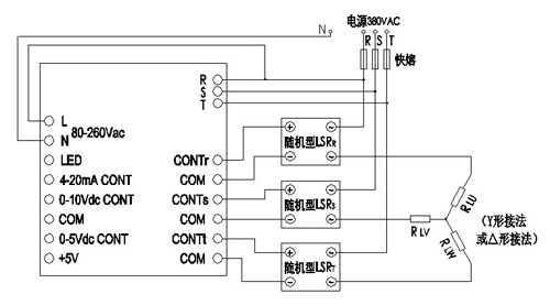 觸發(fā)器TSR可以驅(qū)動從幾十安到數(shù)百安的全系列規(guī)格的隨機(jī)型固態(tài)繼電器,組成簡單經(jīng)濟(jì)的三相調(diào)壓系統(tǒng),此方案一般用于大功率調(diào)壓系統(tǒng)。對于150A規(guī)格以下場合,可選用三相一體化調(diào)壓模塊。