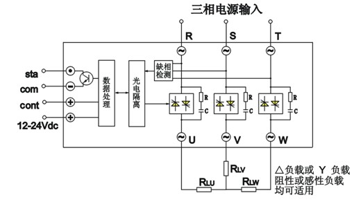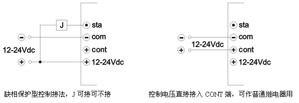 當(dāng)三相電源發(fā)生缺相(缺一相或二相)或斷相,繼電器會(huì)迅速切斷輸出,關(guān)閉工作,進(jìn)入自鎖狀態(tài),直至切斷輸入控制電源,重新加控制電。繼電器內(nèi)置狀態(tài)(STA)輸出端子,為集電極開(kāi)路式,可外接工作電壓3-24Vdc的直流指示燈、蜂鳴器、繼電器,或與其它自動(dòng)控制設(shè)備連接,作報(bào)警提示。若將控制電壓直接輸入CONT端,則也可作普通三相交流固態(tài)繼電器使用。