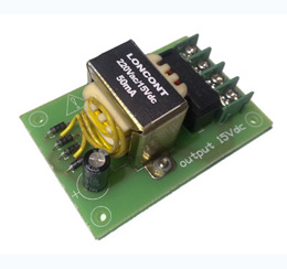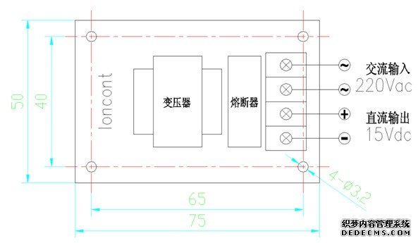 本電源由15V變壓器、1A熔斷器、接線端子、及整流濾波電路的組成,輸入220V交流,輸出15V直流,輸出電流約50mA。外形尺寸:長75*寬50*高35 mm 。如下圖: